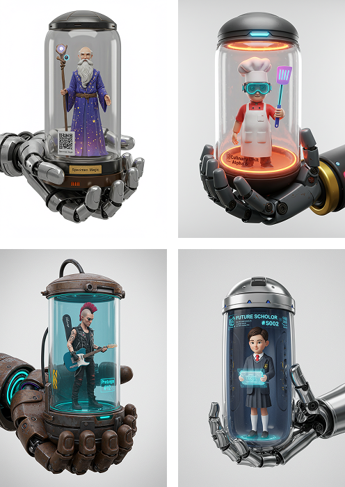 This prompt is ideal for creating futuristic concept art and sci-fi character visuals. It generates hyper-realistic 3D renders of characters or archetypes sealed inside transparent capsules, held by robotic hands (not arms), making it perfect for sci-fi storytelling, character cards, collector visuals, or biotech-inspired NFT collections. Useful in concept design, AI-generated collectibles, dystopian storytelling, and creative portfolios. More....